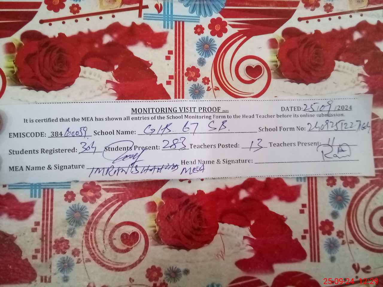 | Attendance Register | Head Teacher | MEA with School | Visit Proof |