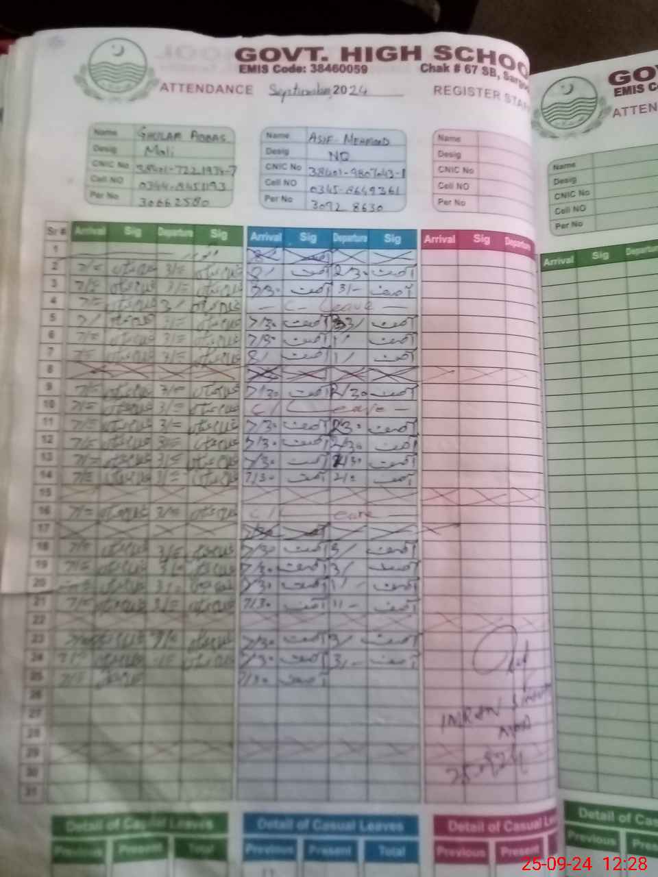 | CNIC | Full Name | Designation | R/C | Absence during last cal. month |