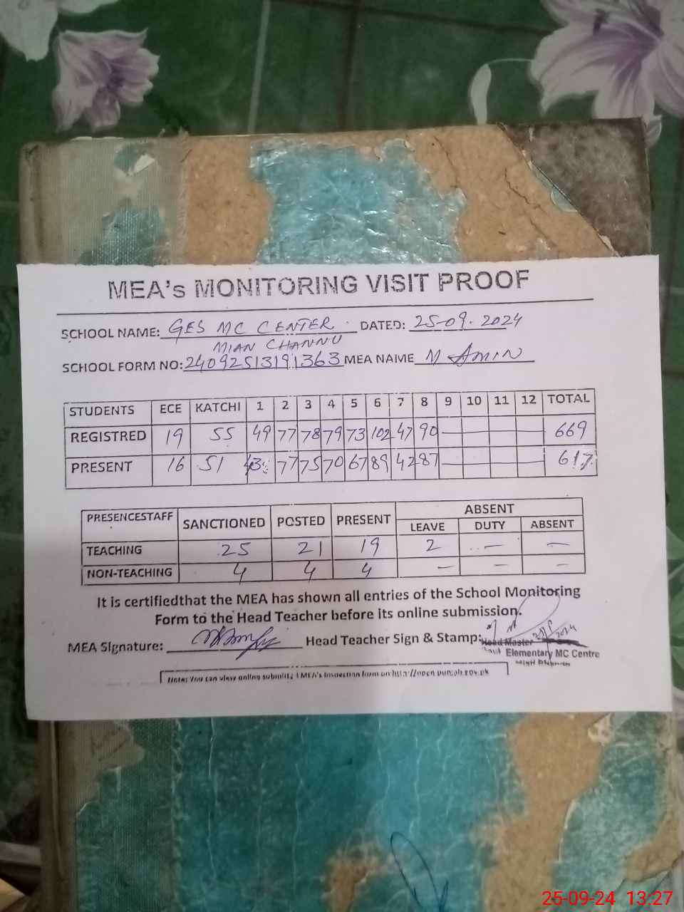 | Attendance Register | Head Teacher | MEA with School | Visit Proof |