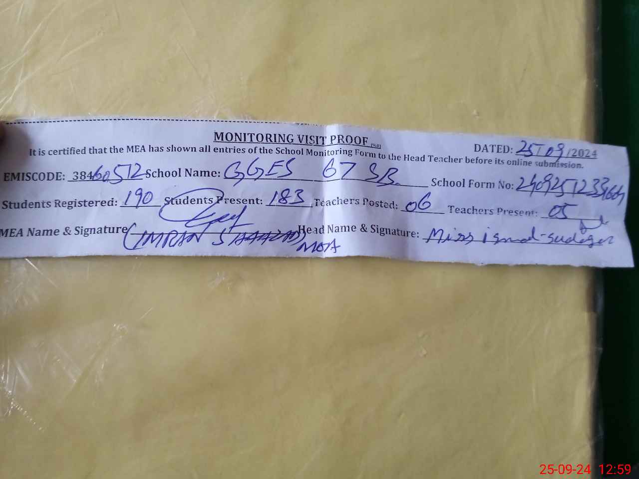 | Attendance Register | Head Teacher | MEA with School | Visit Proof |