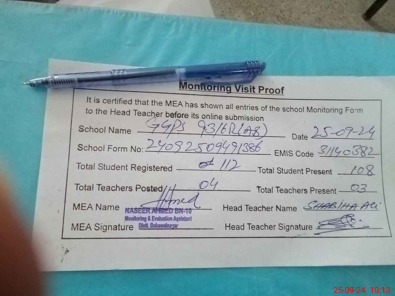 | Attendance Register | Head Teacher | MEA with School | Visit Proof |