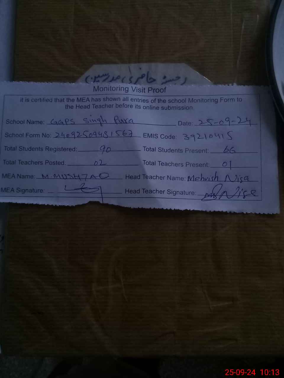 | Attendance Register | Head Teacher | MEA with School | Visit Proof |