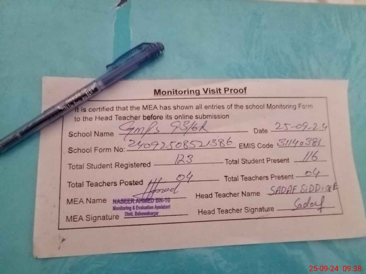 | Attendance Register | Head Teacher | MEA with School | Visit Proof |