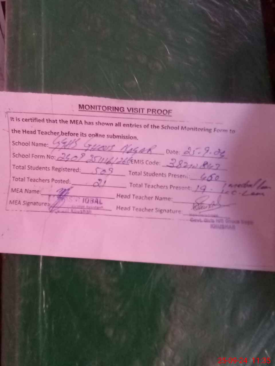 | Attendance Register | Head Teacher | MEA with School | Visit Proof |