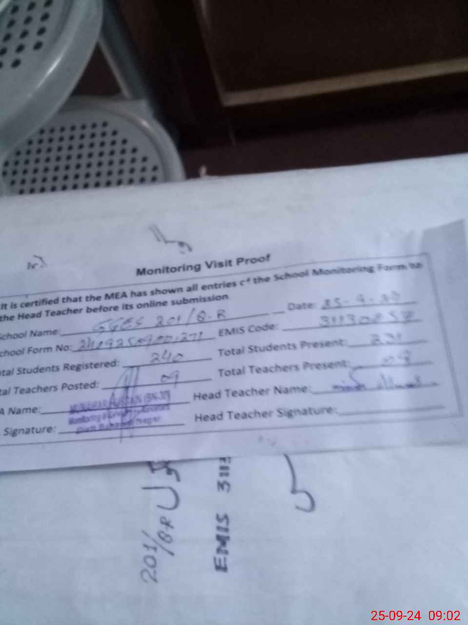 | Attendance Register | Head Teacher | MEA with School | Visit Proof |
