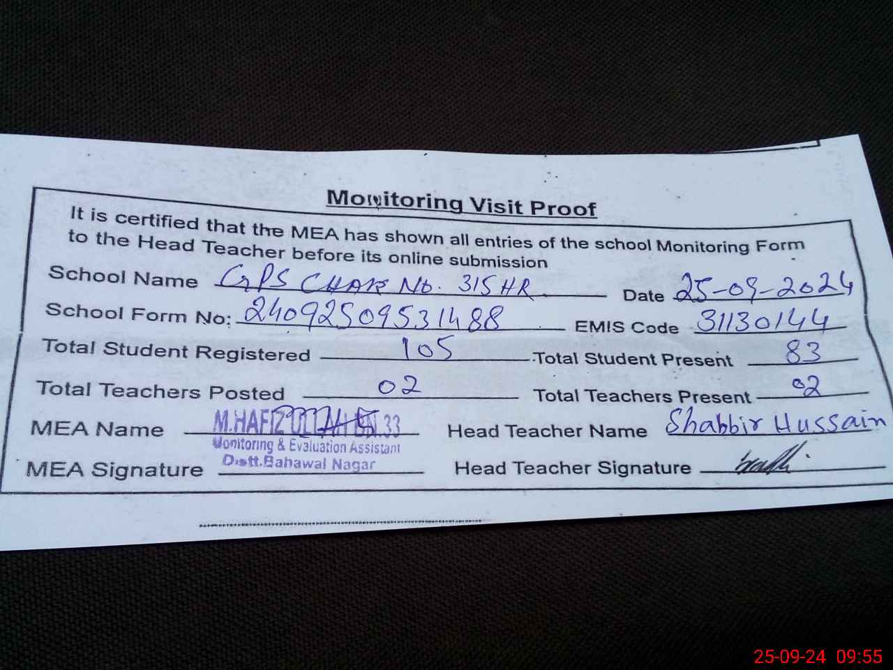 | EMIS Code: 31130144 | Name of School: GPS CHAK 315/HR | |||