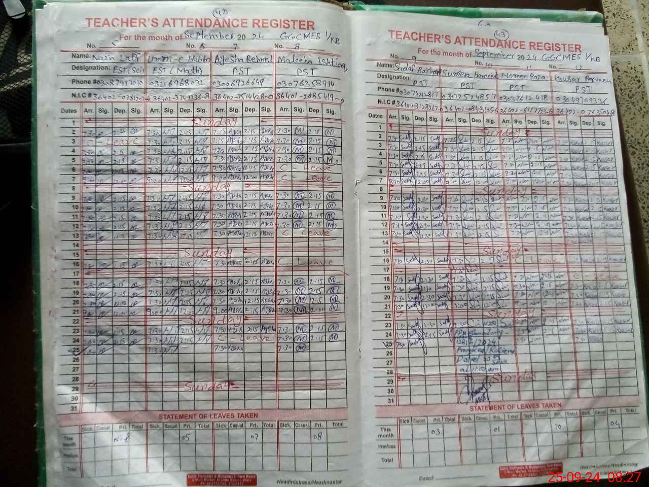 | CNIC | Full Name | Designation | R/C | Absence During Last Calender Month |