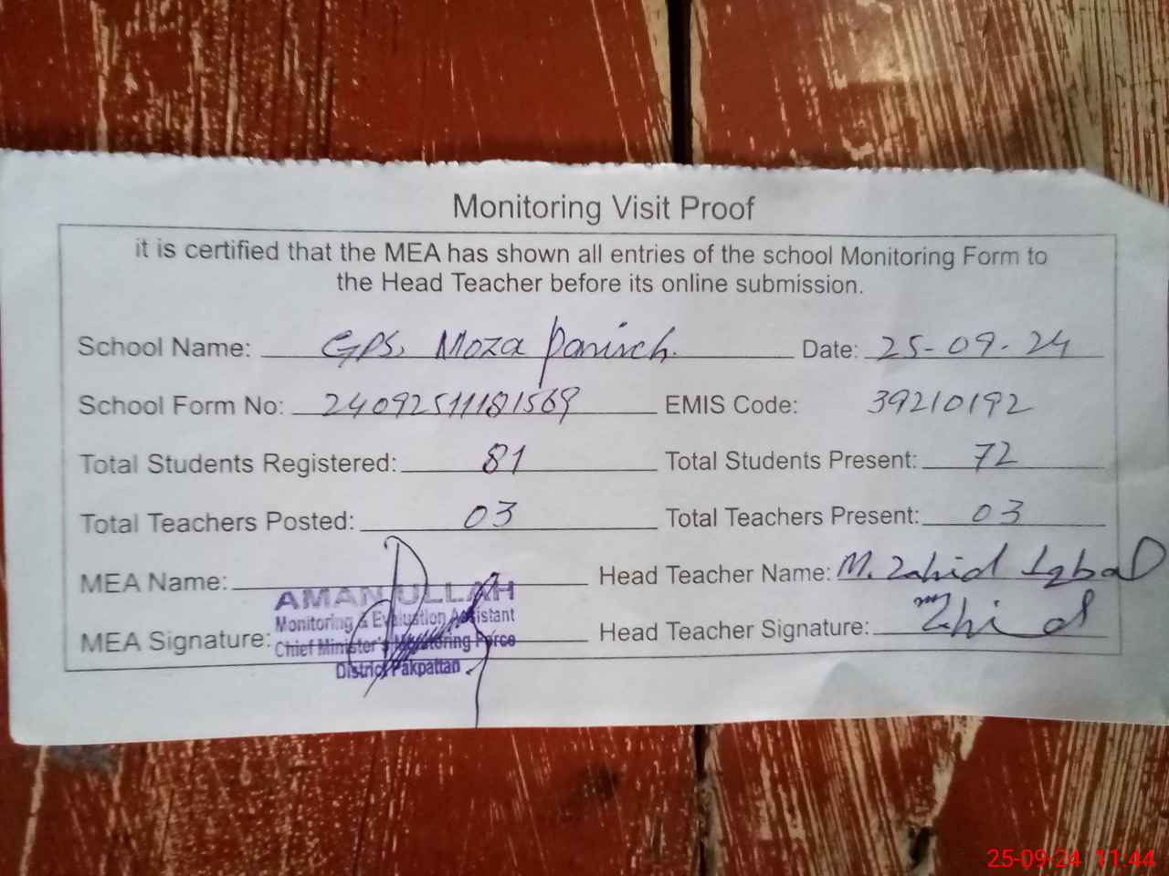 | Attendance Register | Head Teacher | MEA with School | Visit Proof |