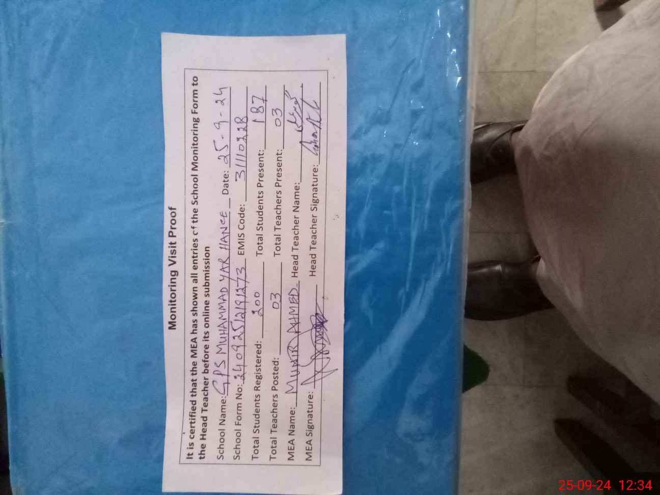 | Attendance Register | Head Teacher | MEA with School | Visit Proof |