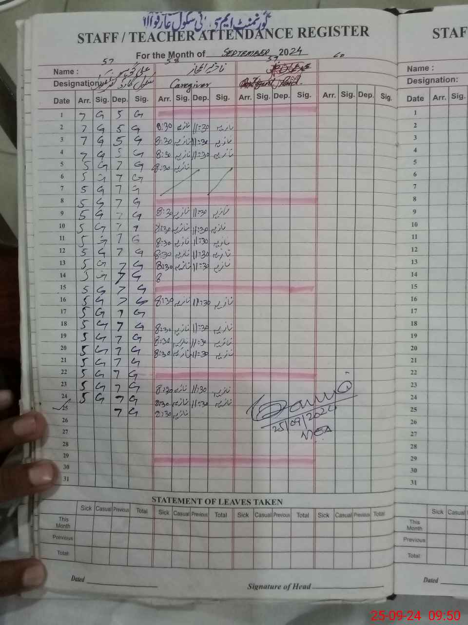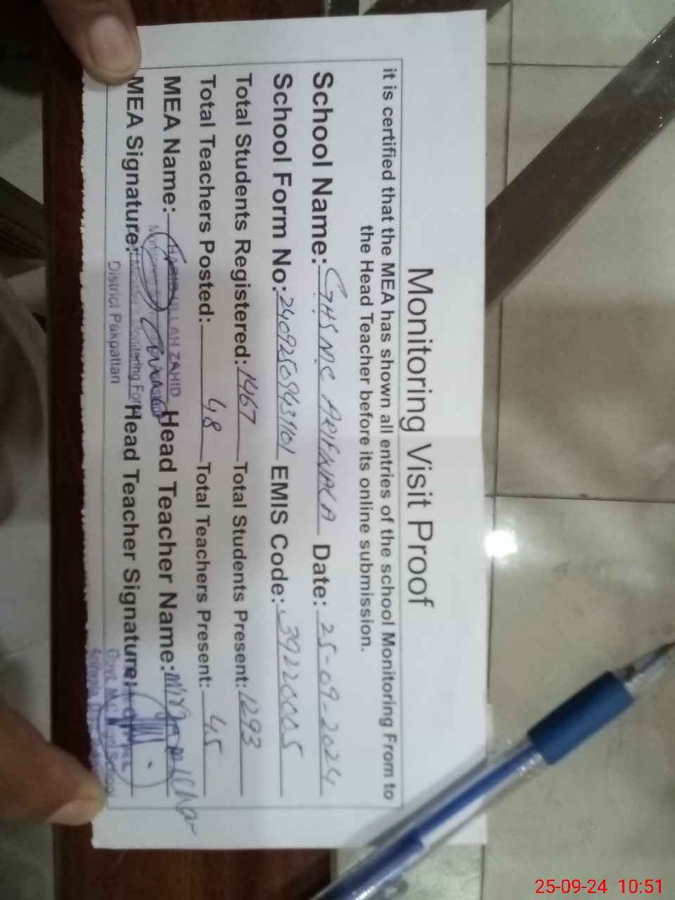 | Attendance Register | Head Teacher | MEA with School | Visit Proof |