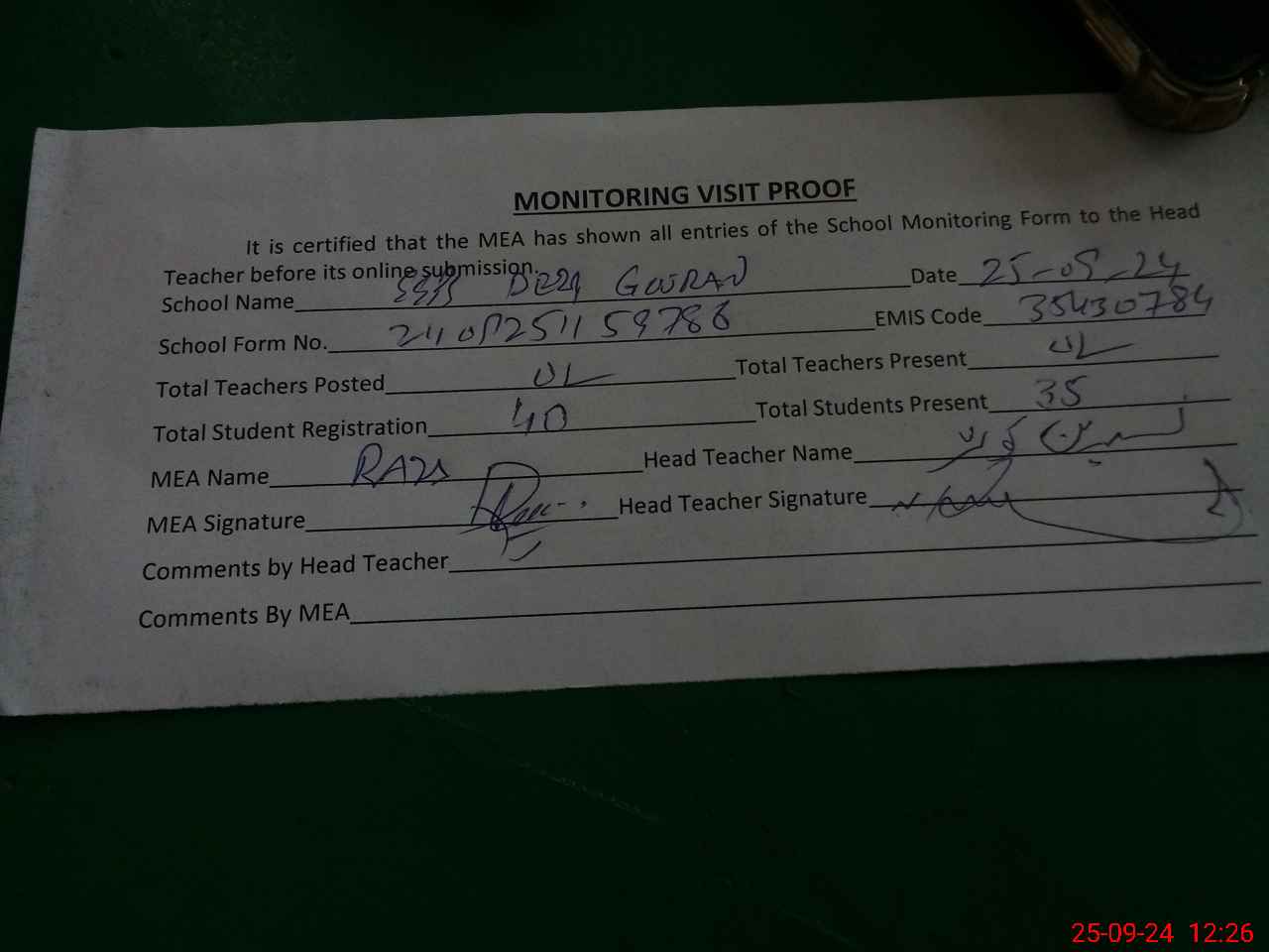 | Attendance Register | Head Teacher | MEA with School | Visit Proof |