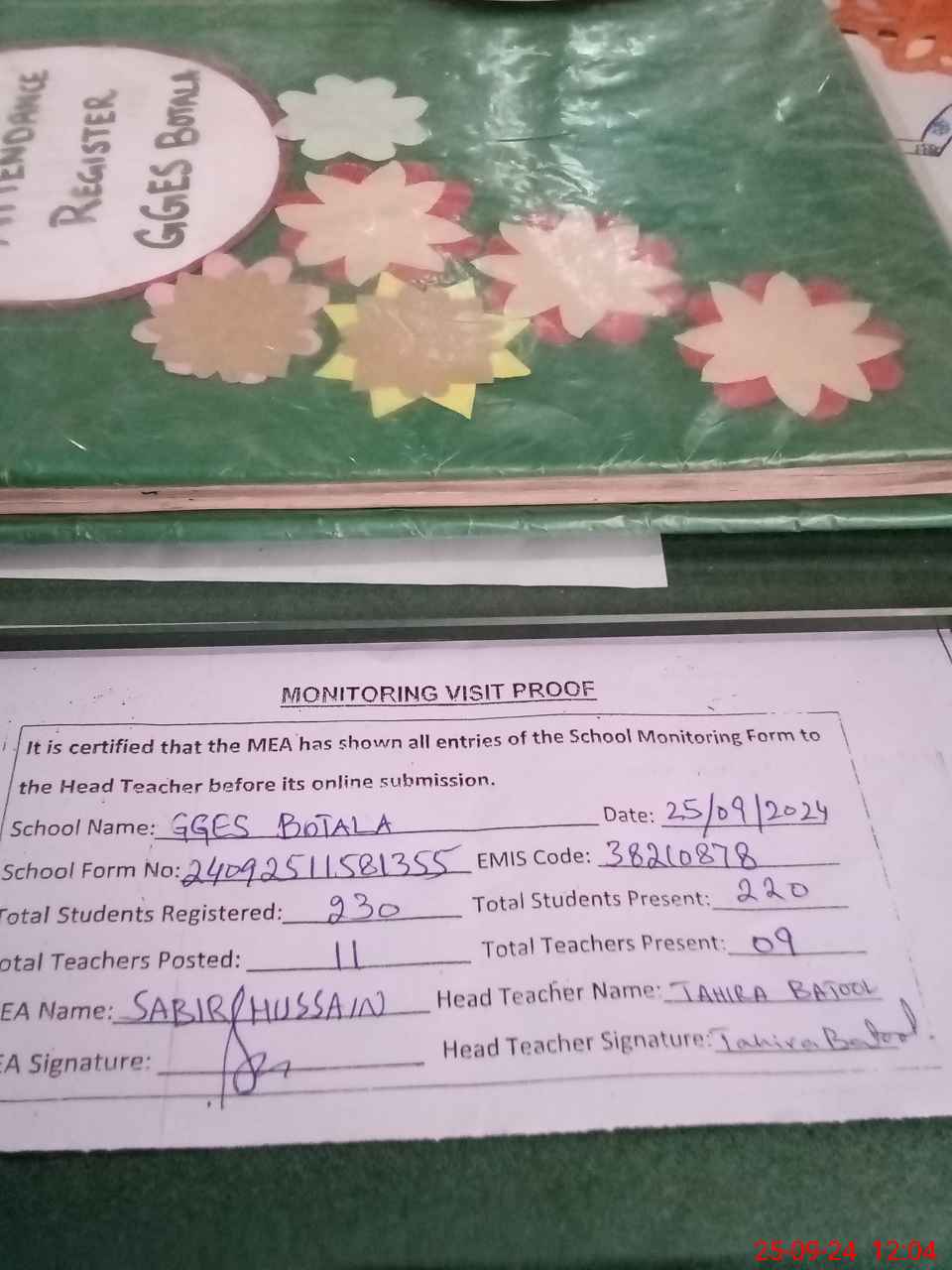 | Attendance Register | Head Teacher | MEA with School | Visit Proof |