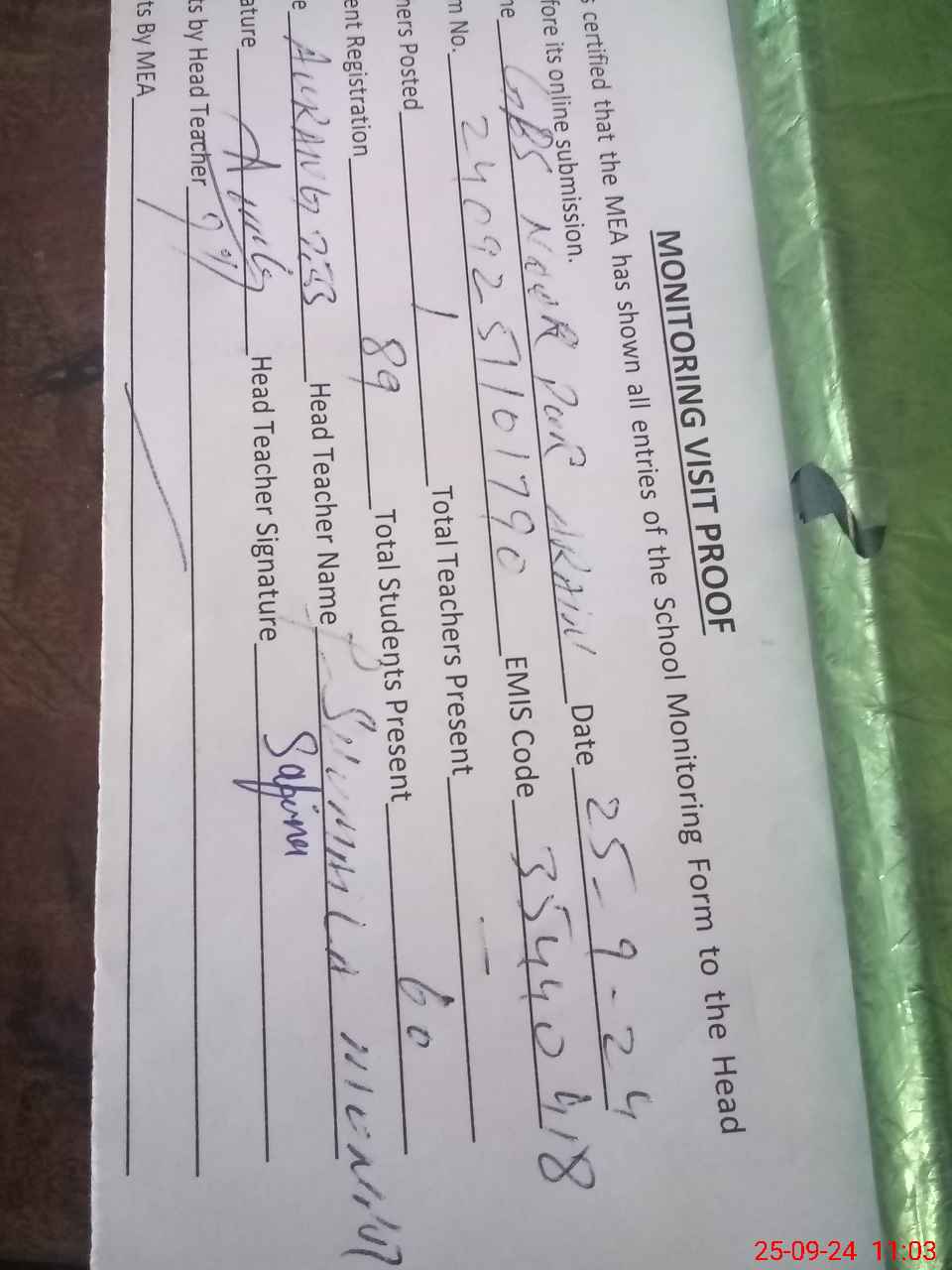 | Attendance Register | Head Teacher | MEA with School | Visit Proof |