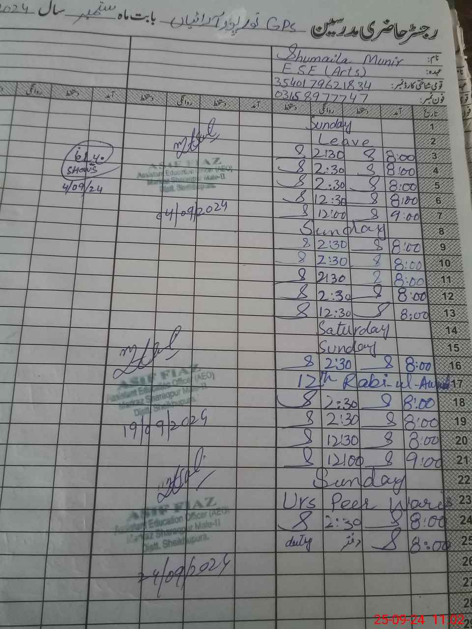 | Name: Sh**** Mu**** Designation: (School Headmaster's/Headmistress's) ESE Arts Phone/Cell Number: 03**** |