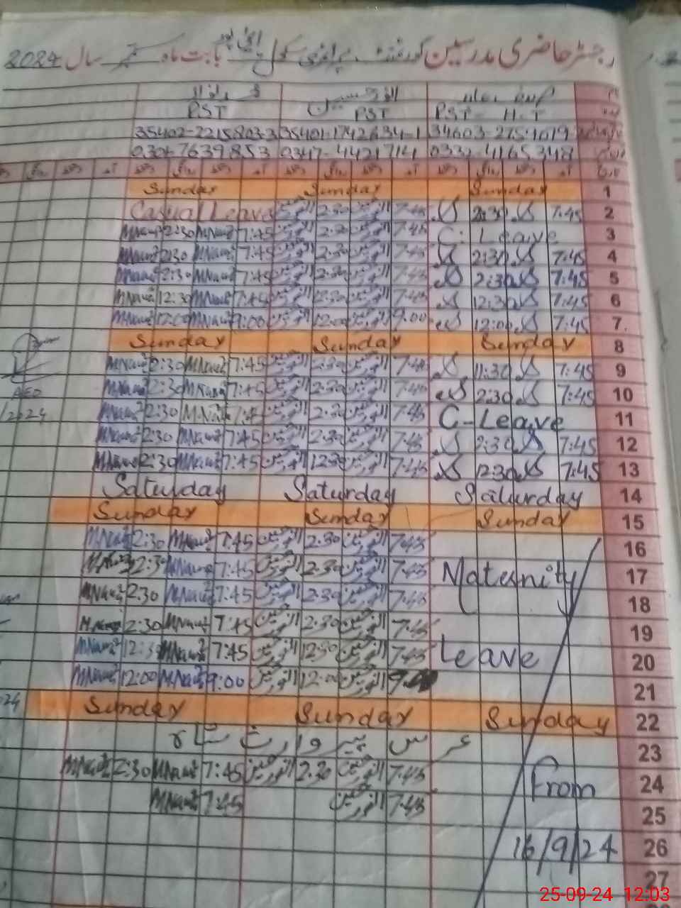 | 34**** | Sa**** Ab**** | PST | Regular | 1 | 0 | 0 | 0 | 0 | 0 | 0 | 0 | 1 | Maternity |