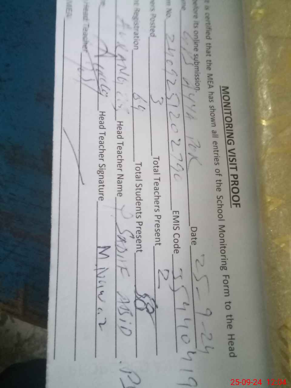 | Attendance Register | Head Teacher | MEA with School | Visit Proof |
