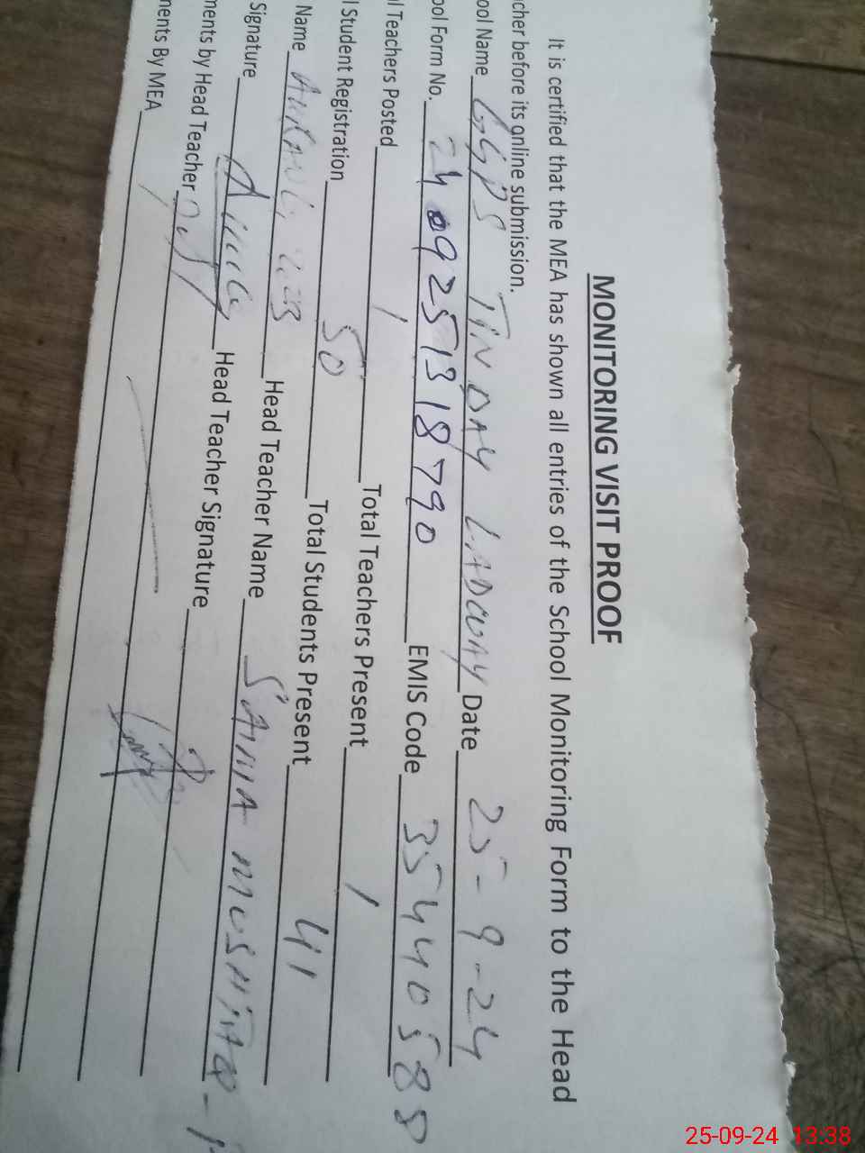 | Attendance Register | Head Teacher | MEA with School | Visit Proof |