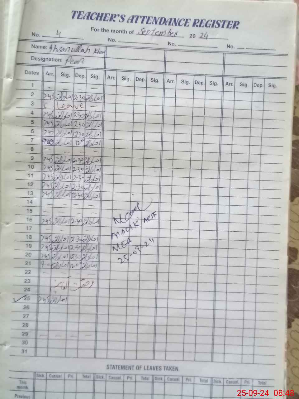 | CNIC | Full Name | Designation | R/C | Absence During Last Calender Month |