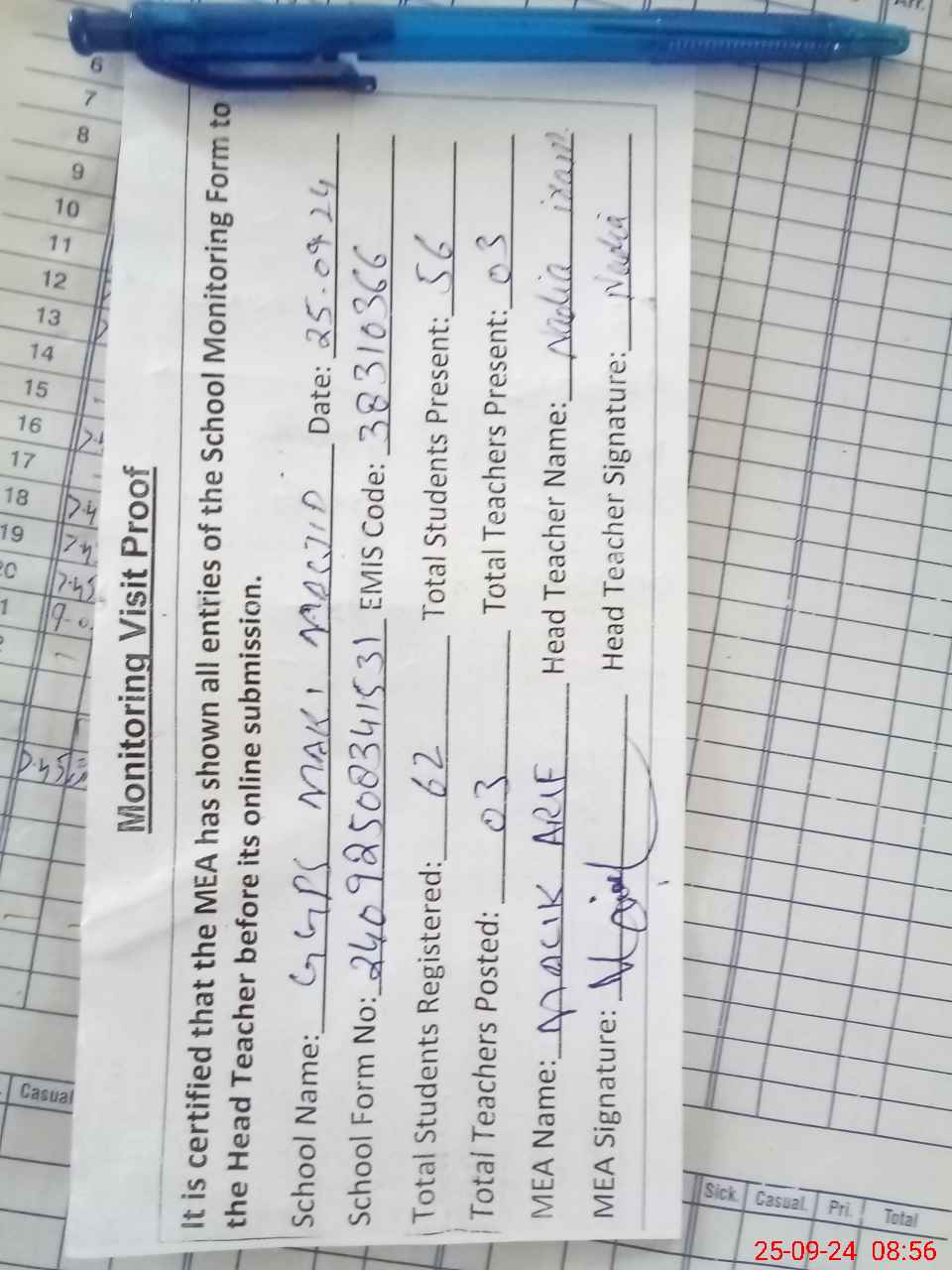 | Attendance Register | Head Teacher | MEA with School | Visit Proof |