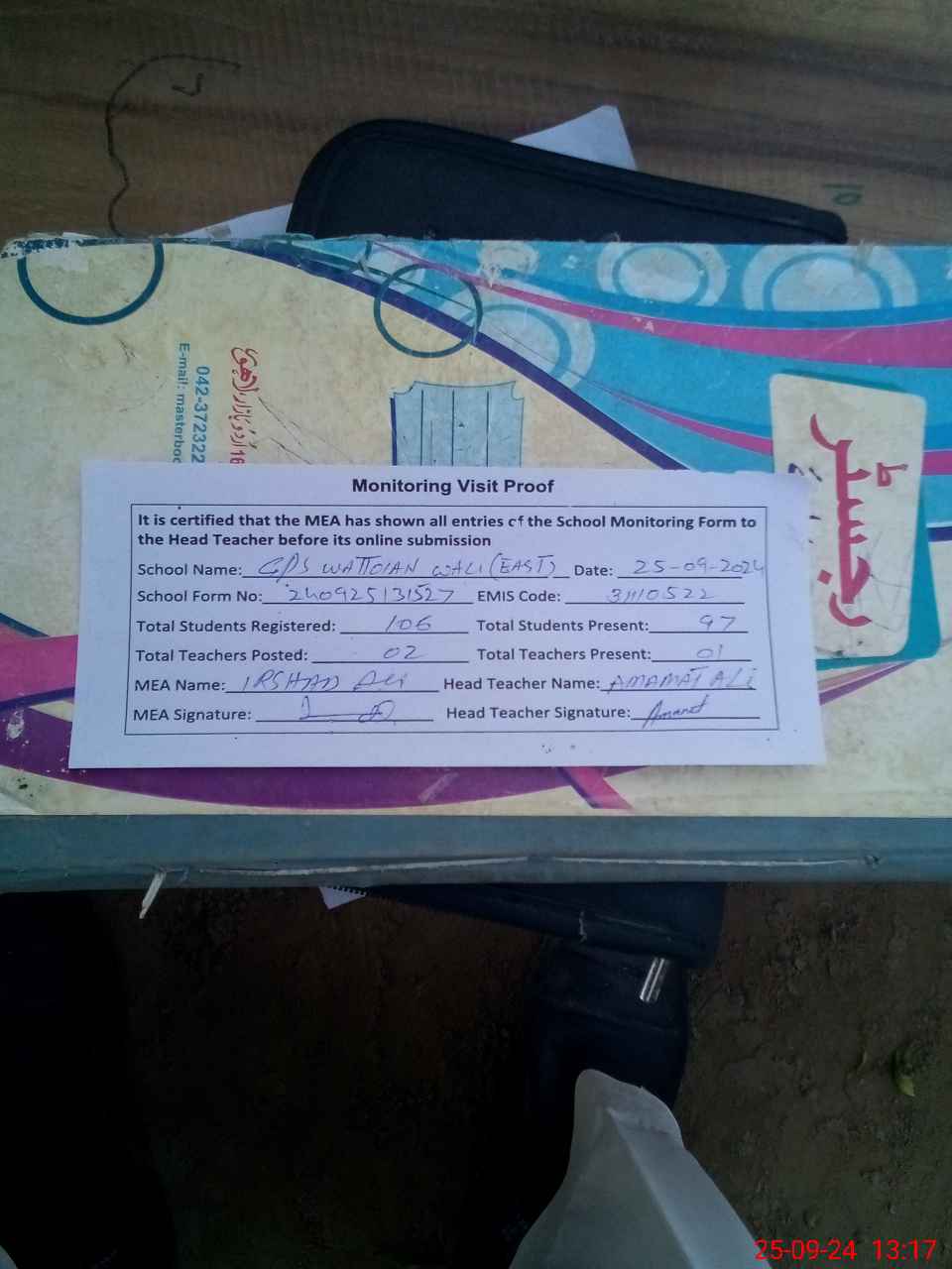 | Attendance Register | Head Teacher | MEA with School | Visit Proof |