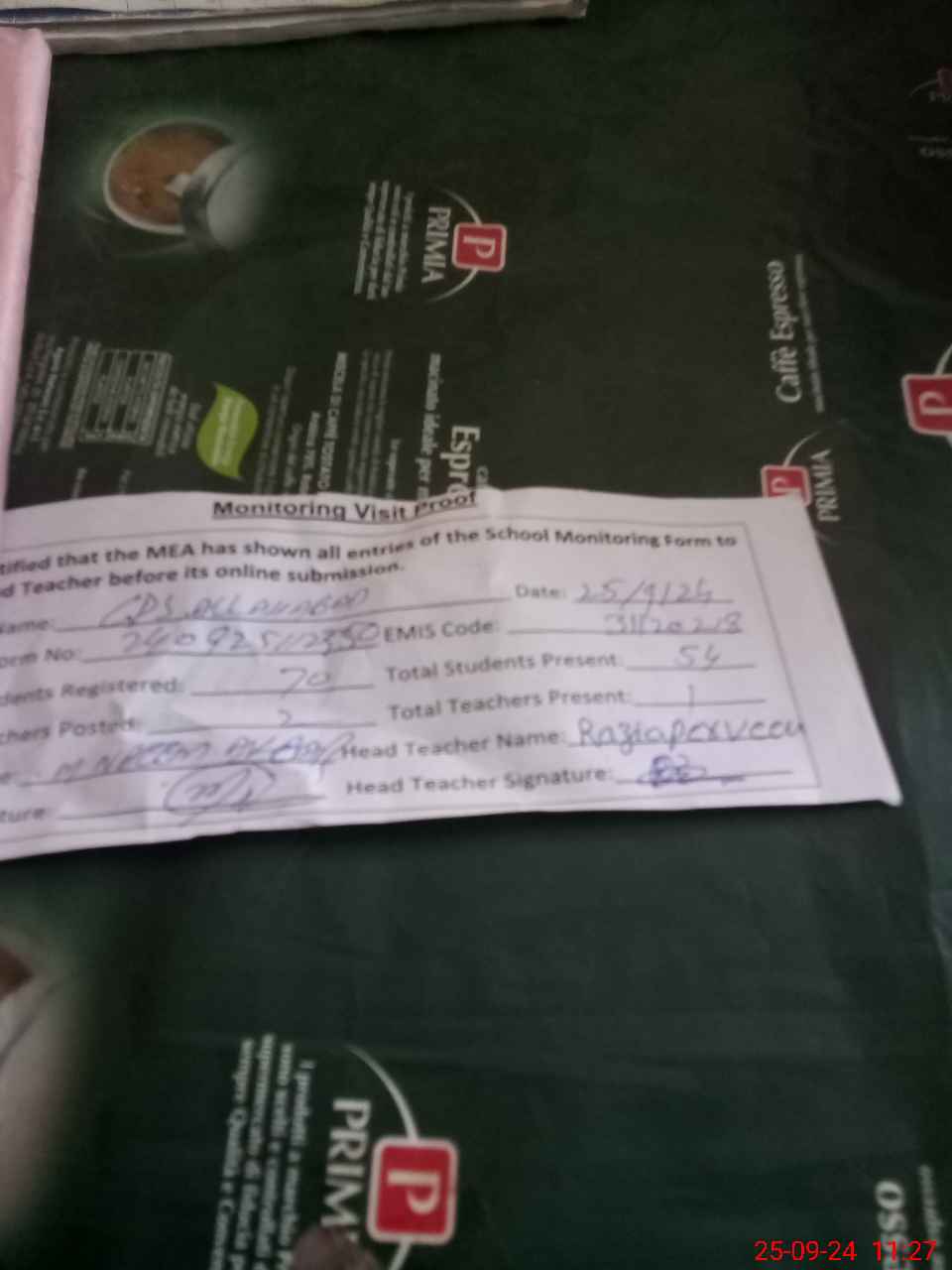 | Attendance Register | Head Teacher | MEA with School | Visit Proof |