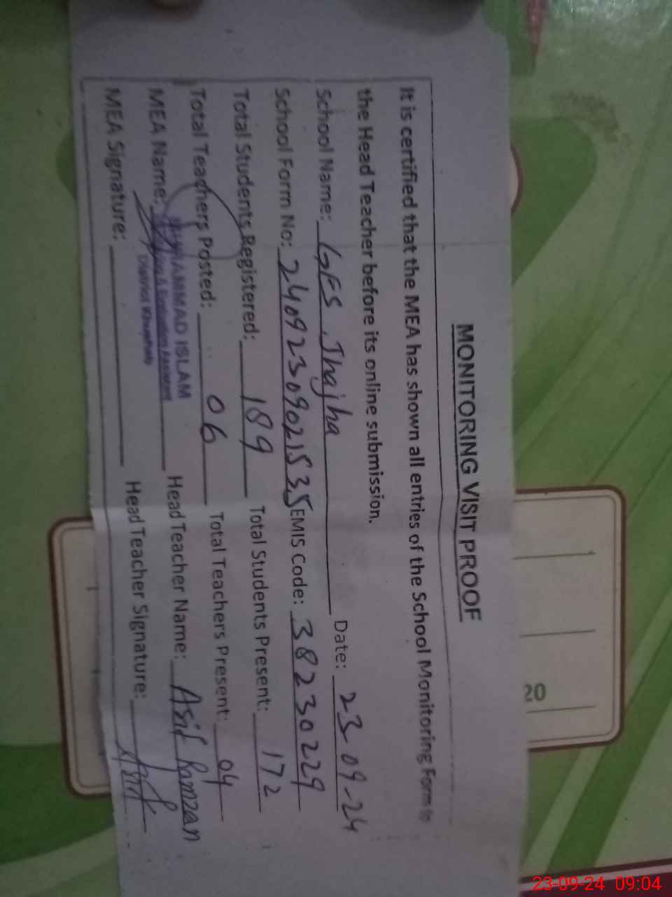 | Attendance Register | Head Teacher | MEA with School | Visit Proof |