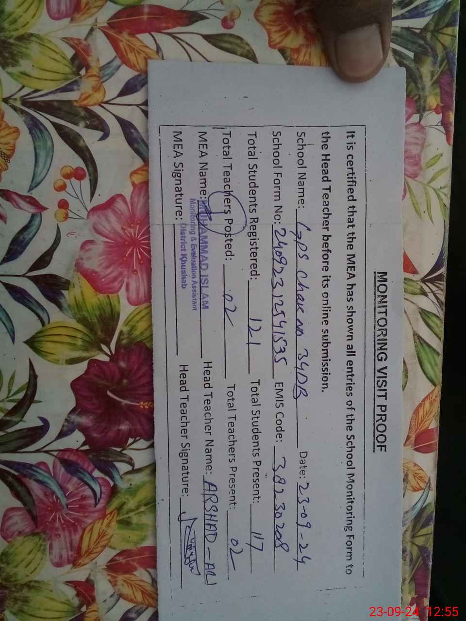 | Attendance Register | Head Teacher | MEA with School | Visit Proof |
