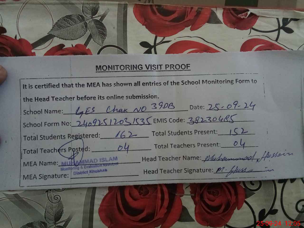 | Attendance Register | Head Teacher | MEA with School | Visit Proof |