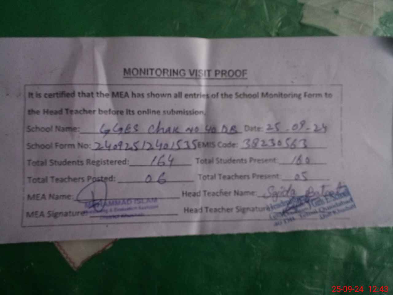 | EMIS Code: 38230563 | Name of School: GGES CHAK NO.40 DB | |||