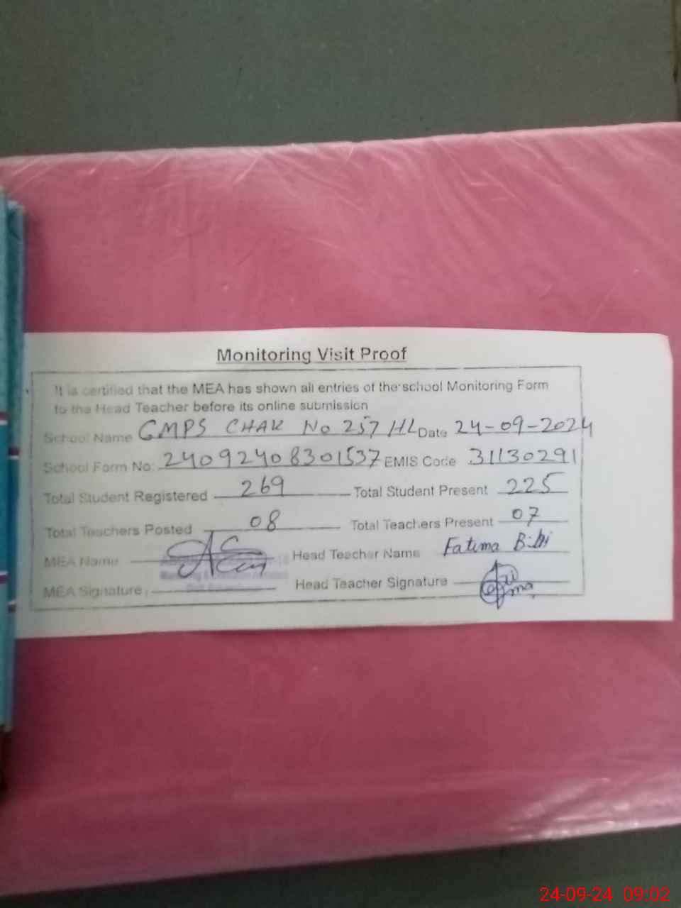 | Attendance Register | Head Teacher | MEA with School | Visit Proof |