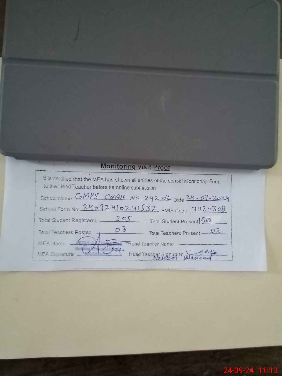| EMIS Code: 31130308 | Name of School: GMPS CHAK NO. 242 HL | |||