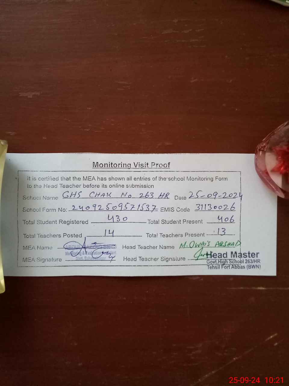 | Attendance Register | Head Teacher | MEA with School | Visit Proof |