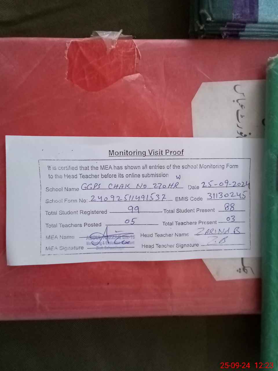 | EMIS Code: 31130245 | Name of School: GGPS CHAK NO. 270/HR-W | |||