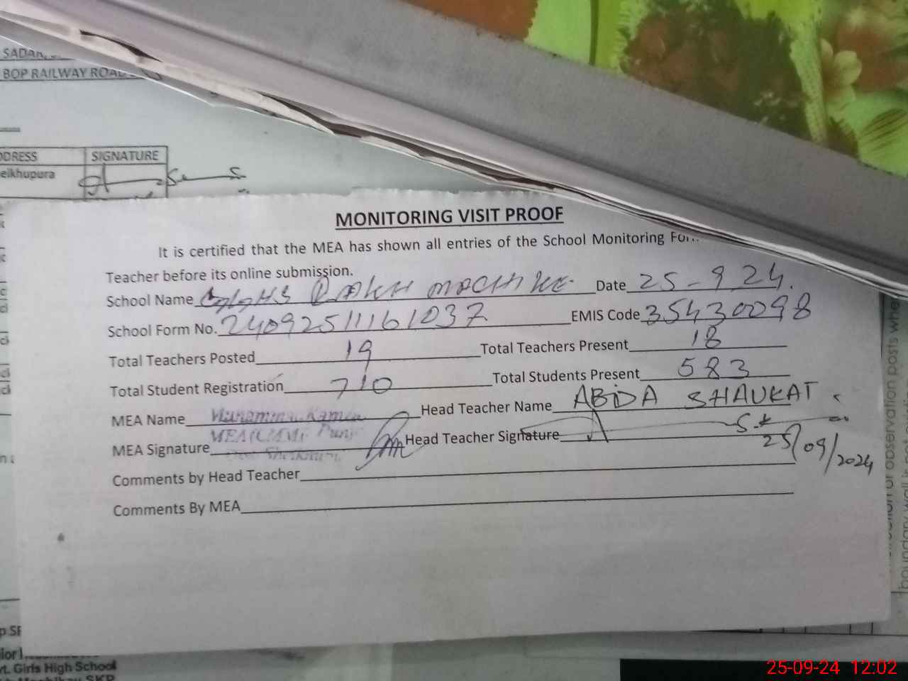 | Attendance Register | Head Teacher | MEA with School | Visit Proof |