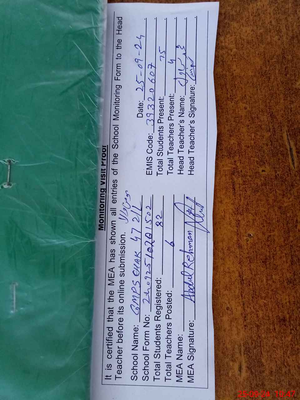| Attendance Register | Head Teacher | MEA with School | Visit Proof |