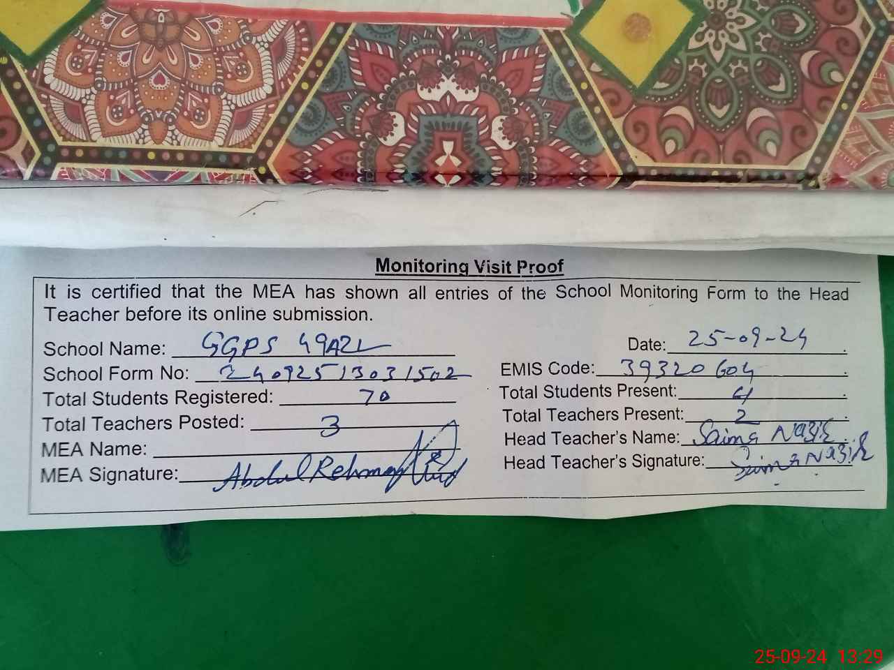 | Attendance Register | Head Teacher | MEA with School | Visit Proof |