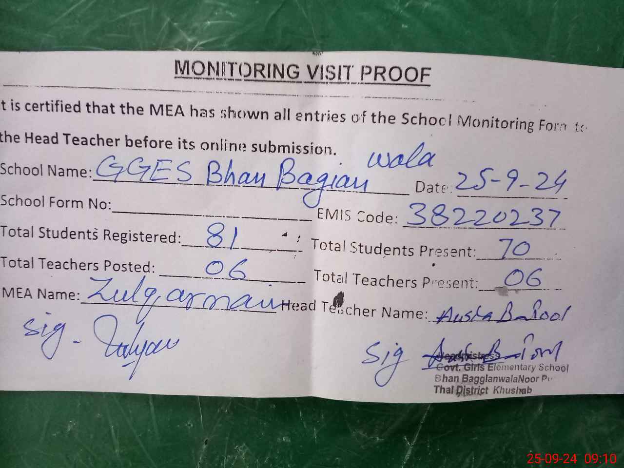 | Attendance Register | Head Teacher | MEA with School | Visit Proof |