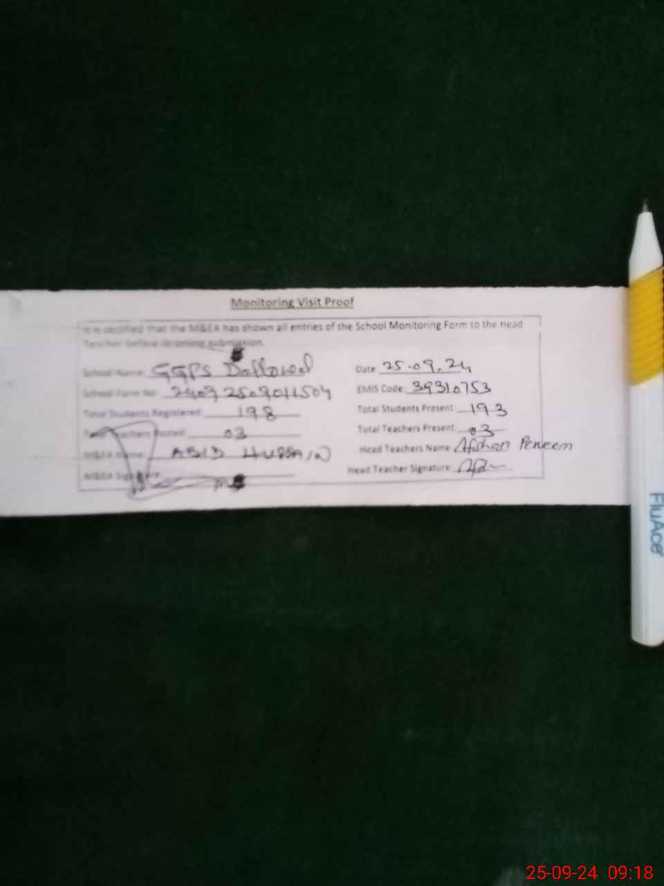 | Attendance Register | Head Teacher | MEA with School | Visit Proof |