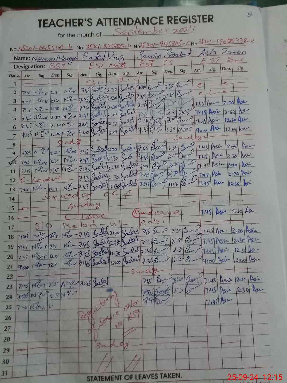 | CNIC | Full Name | Designation | R/C | Absence During Last Calender Month |