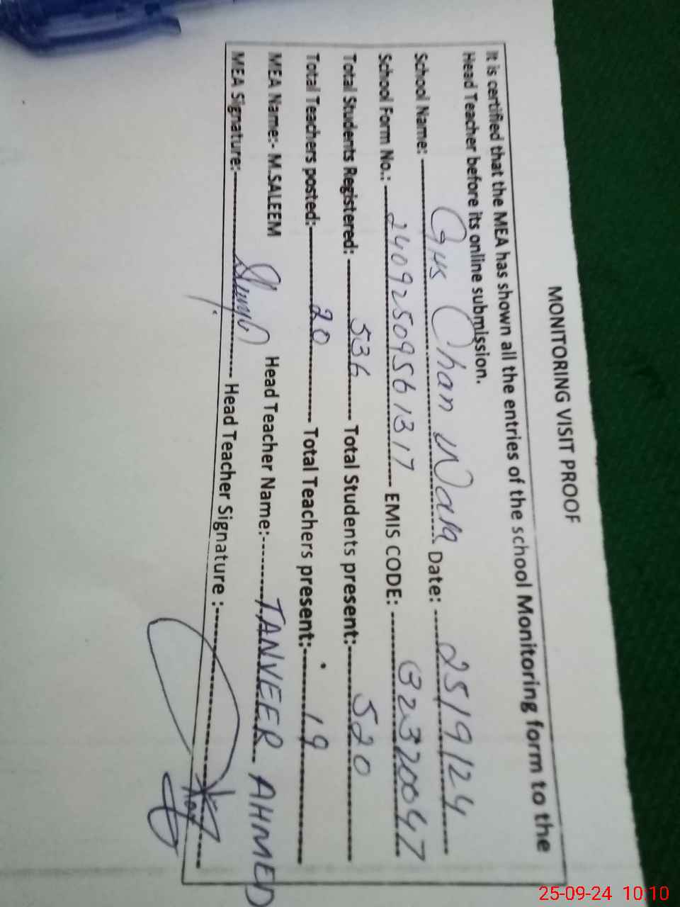 | Certified that this School was Inspected by the Undersigned MEA/DMO Today and the Information Stated Above is as Per Record. | |||||