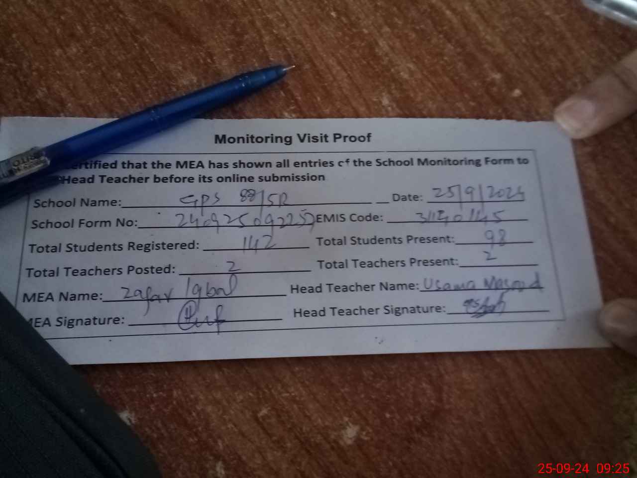 | Attendance Register | Head Teacher | MEA with School | Visit Proof |