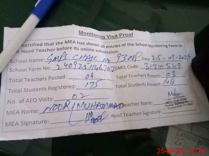 | EMIS Code: 31310549 | Name of School: GMPS CHAK NO. 93/NP (After Noon) | |||