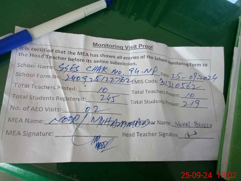 | EMIS Code: 31310562 | Name of School: GGES CHAK NO. 94/NP | |||
