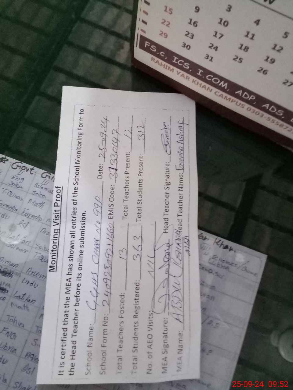 | Attendance Register | Head Teacher | MEA with School | Visit Proof |