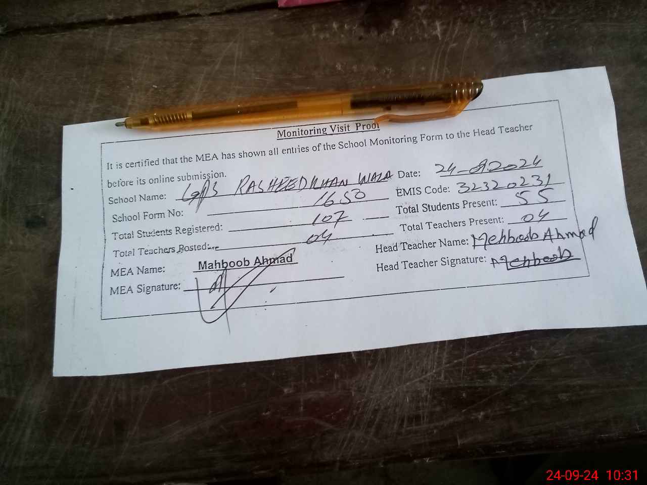 | Attendance Register | Head Teacher | MEA with School | Visit Proof |