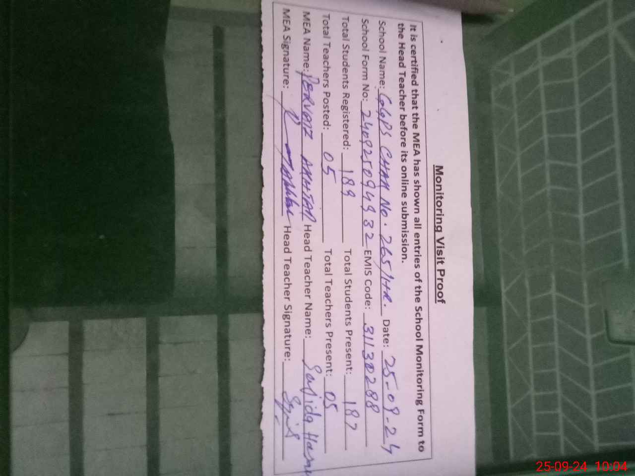 | Attendance Register | Head Teacher | MEA with School | Visit Proof |