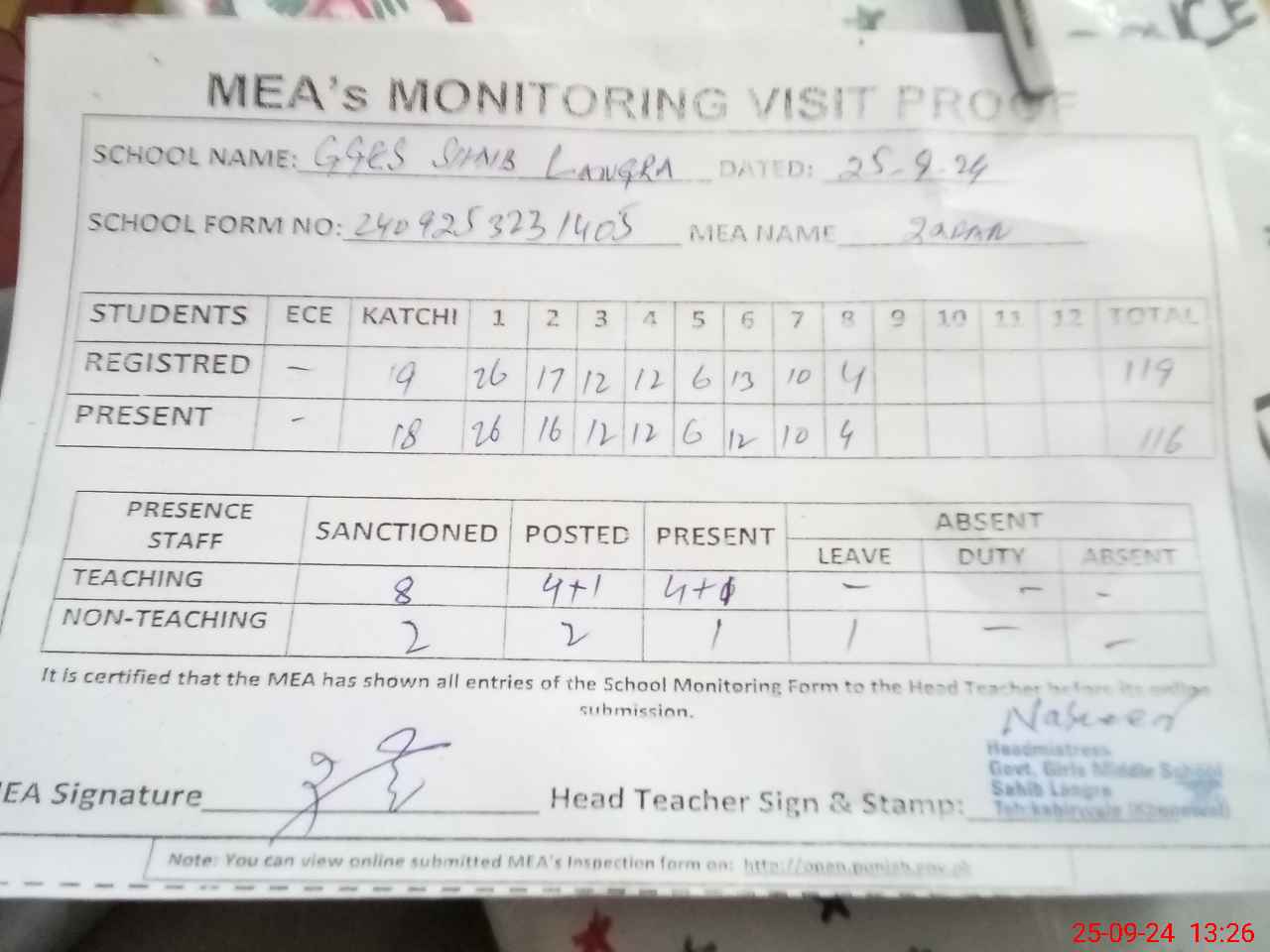 | Attendance Register | Head Teacher | MEA with School | Visit Proof |