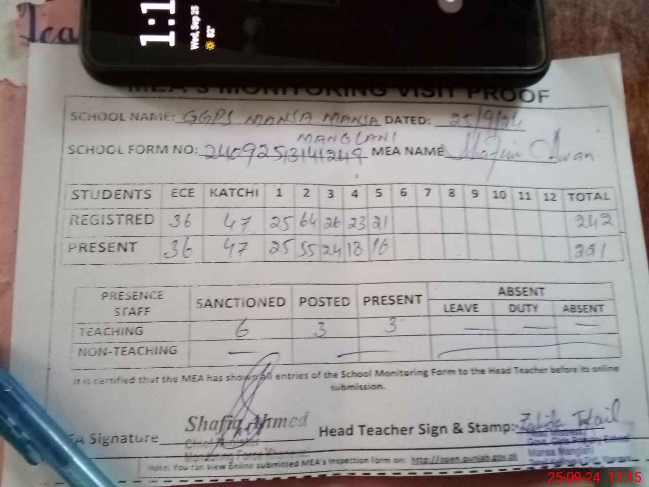 | Attendance Register | Head Teacher | MEA with School | Visit Proof |