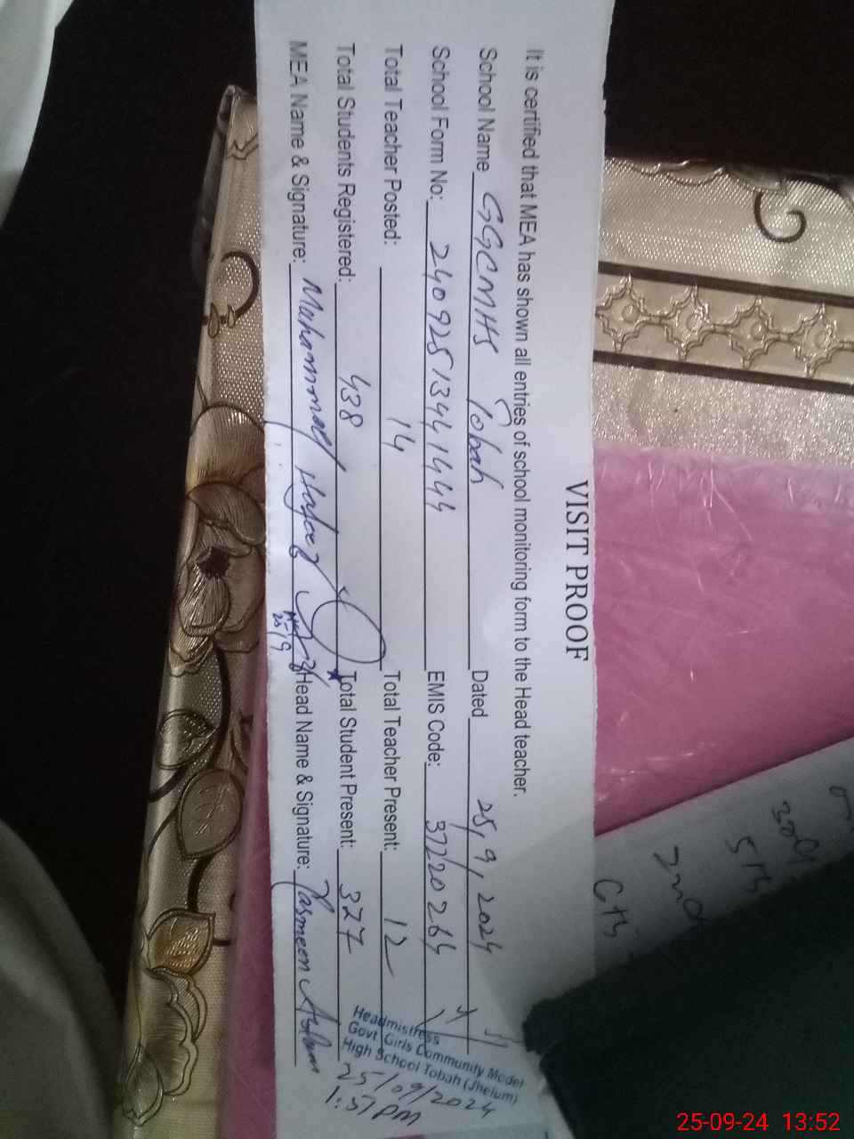 | Remarks (Use Separate Page if Required): Sir GGCMS Tobah37220264 cleaning very very poor hand wash point not functioning Classroom cleaning very poor Picture are available PST teacher Faraht Aftab not rolled of students on students register on 24 and 25 September 2024 Mostly register of students roll are not complete EST teacher Samah Shafiq applied met leave but one time rejected from DEO applied again but till to date not approved from higher authorities and was not present in school from 16 September to date 25 September 2024 Sir please check and instruct strictly | |||||