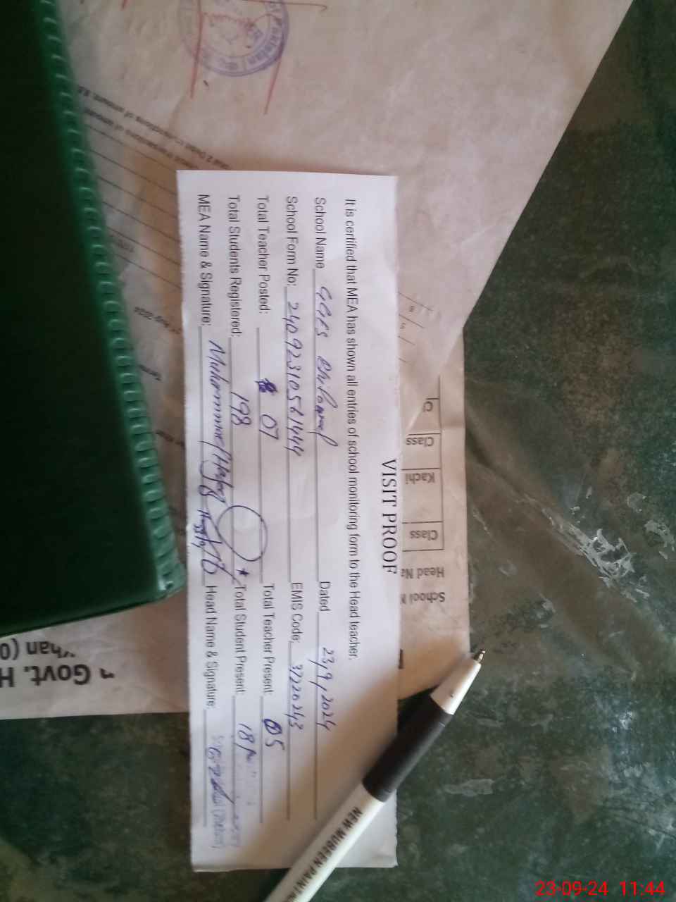 | Attendance Register | Head Teacher | MEA with School | Visit Proof |